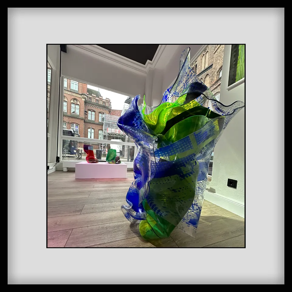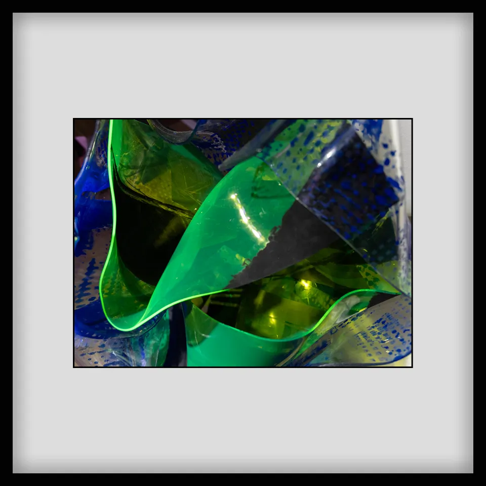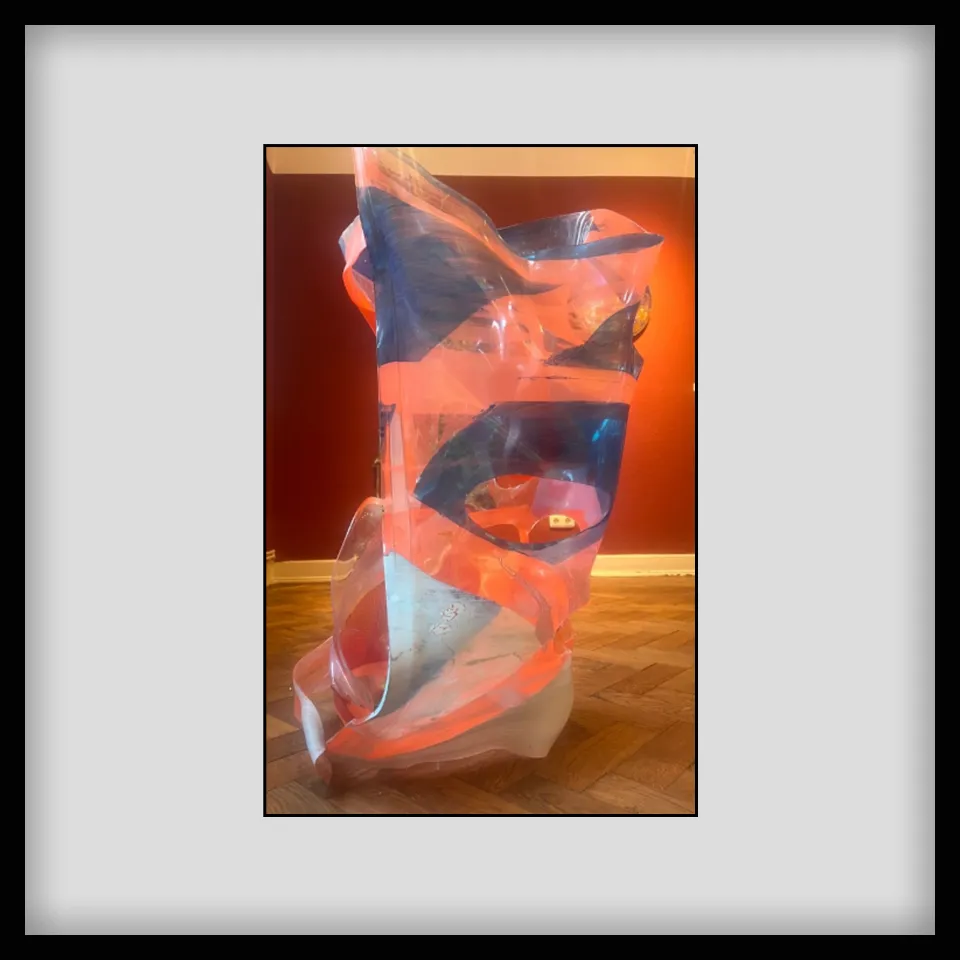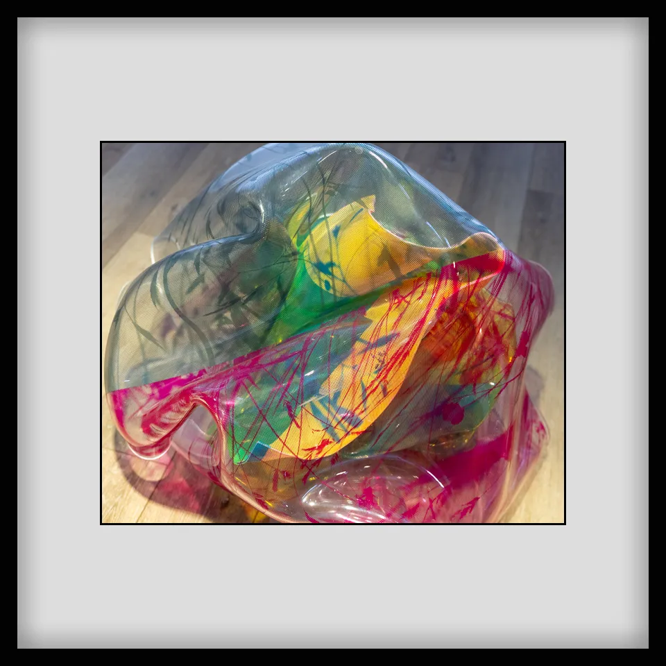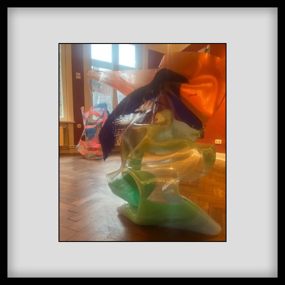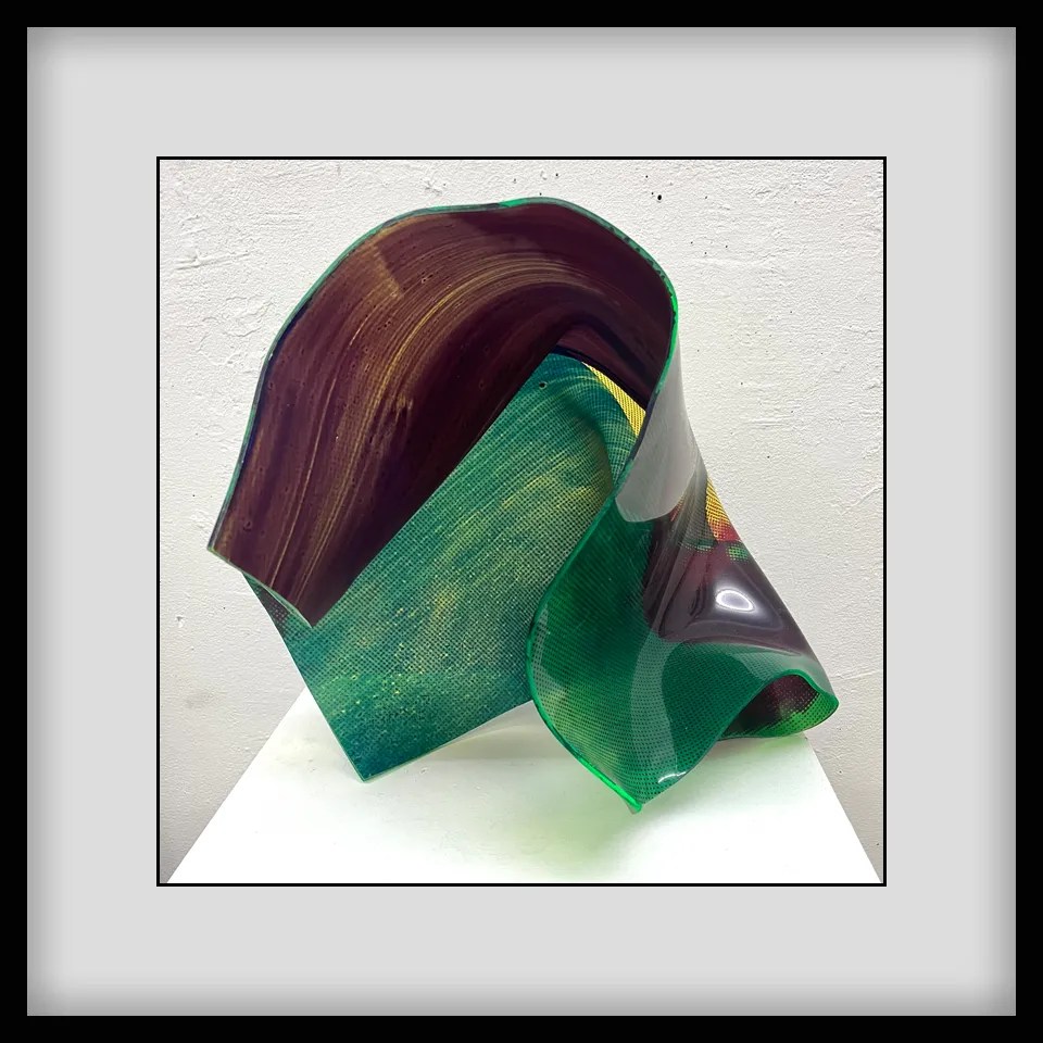 His process is characterized by physical engagement and unpredictability. Layers of color are poured, bent, and shaped under heat, forming sculptural planes that retain the traces of their manipulation. These gestures are not erased in the final work; rather, they remain visible as signs of resistance, gravity, and motion. The material thus records its own history - a visual memory of change. Light plays a crucial role in this transformation. As it moves across the folded and translucent surfaces, the work continually redefines itself, oscillating between presence and disappearance. The result is not a static object but a dynamic field in which pigment, transparency, and reflection interact.